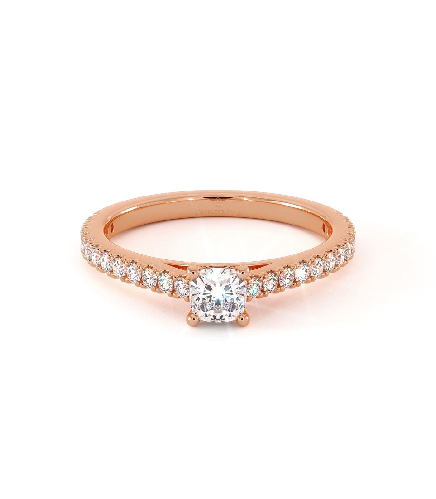 Solitaire Odessa en or 750/1000, pavé de diamants, orné d’un diamant central taille coussin. Une monture délicate et lumineuse, au style classique et raffiné. Poids total diamant : 0,40 à 0,80 ct.