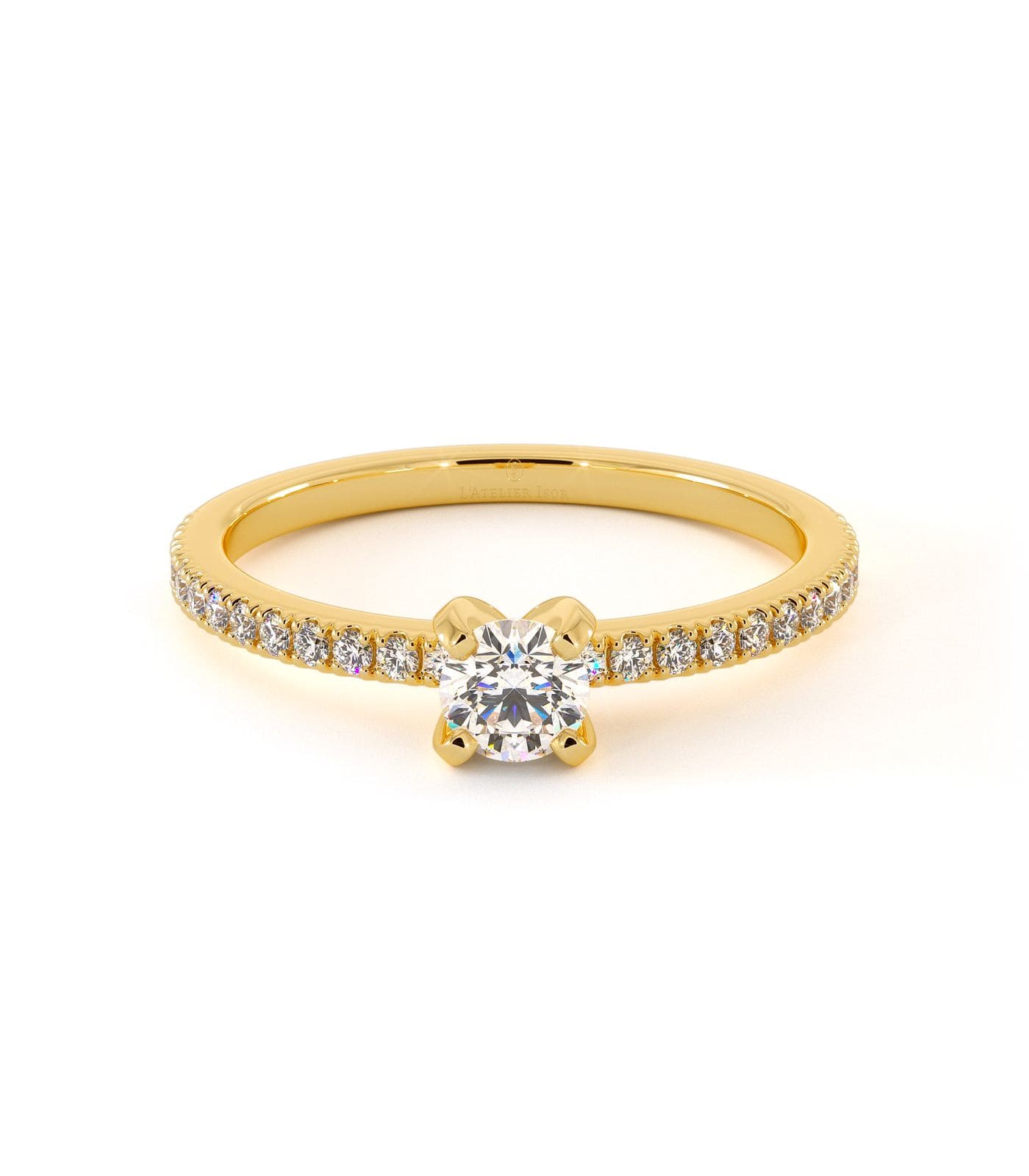 La bague de fiançailles PRUNELLE en or 18 carats incarne l'harmonie et la finesse. Elle porte en son centre une pierre centrale en diamant 0,15 carats taille brillant sertie 4 griffes. Son corps de bague au pavage de diamants disposés le long du bijou révèle le caractère parfait de son diamant central.