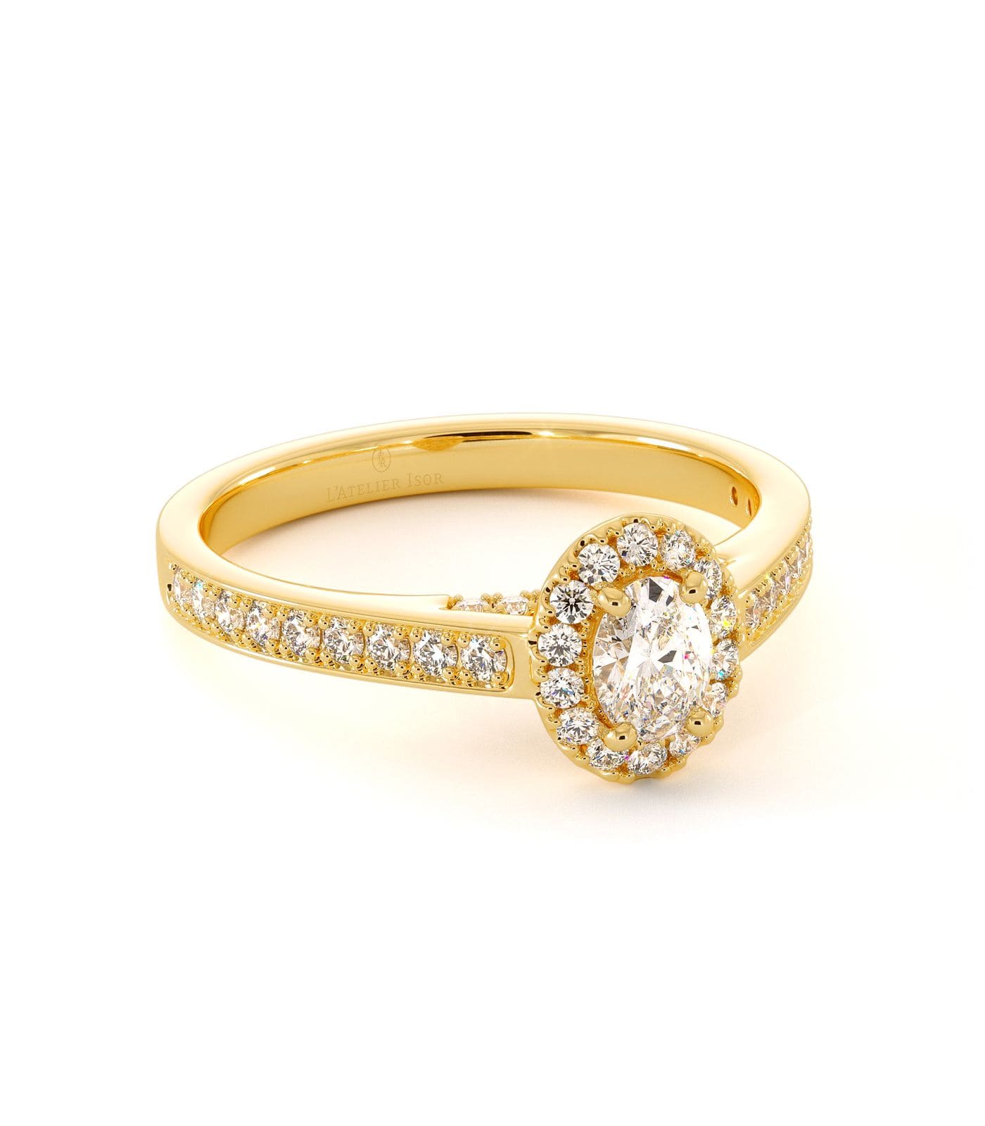 Solitaire Purple Rain en or 750/1000, sublimé par un diamant ovale de 0,25 ct, entouré d’un halo et d’un pavage délicat aux finitions perlées.