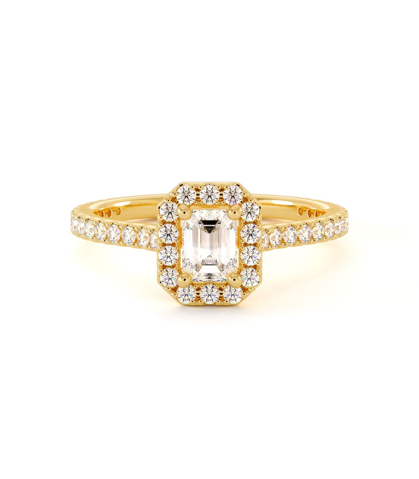 Best-seller de la Maison, le solitaire Sahel en or 750/1000 est rehaussé d’un diamant taille émeraude et d’un halo lumineux. Un classique éclatant à associer avec l’alliance Makian.