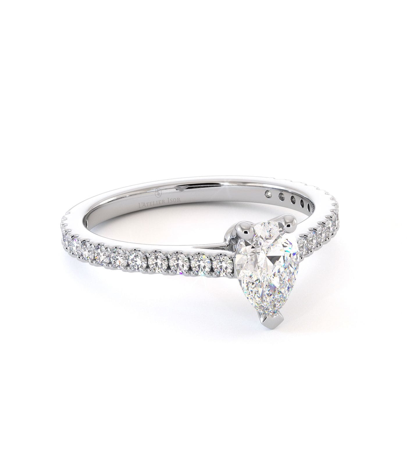 Solitaire Terra en or 750/1000, pavé de diamants, orné d’un diamant central taille poire. Un design fin et lumineux, idéal seul ou accompagné de l’alliance Makian.