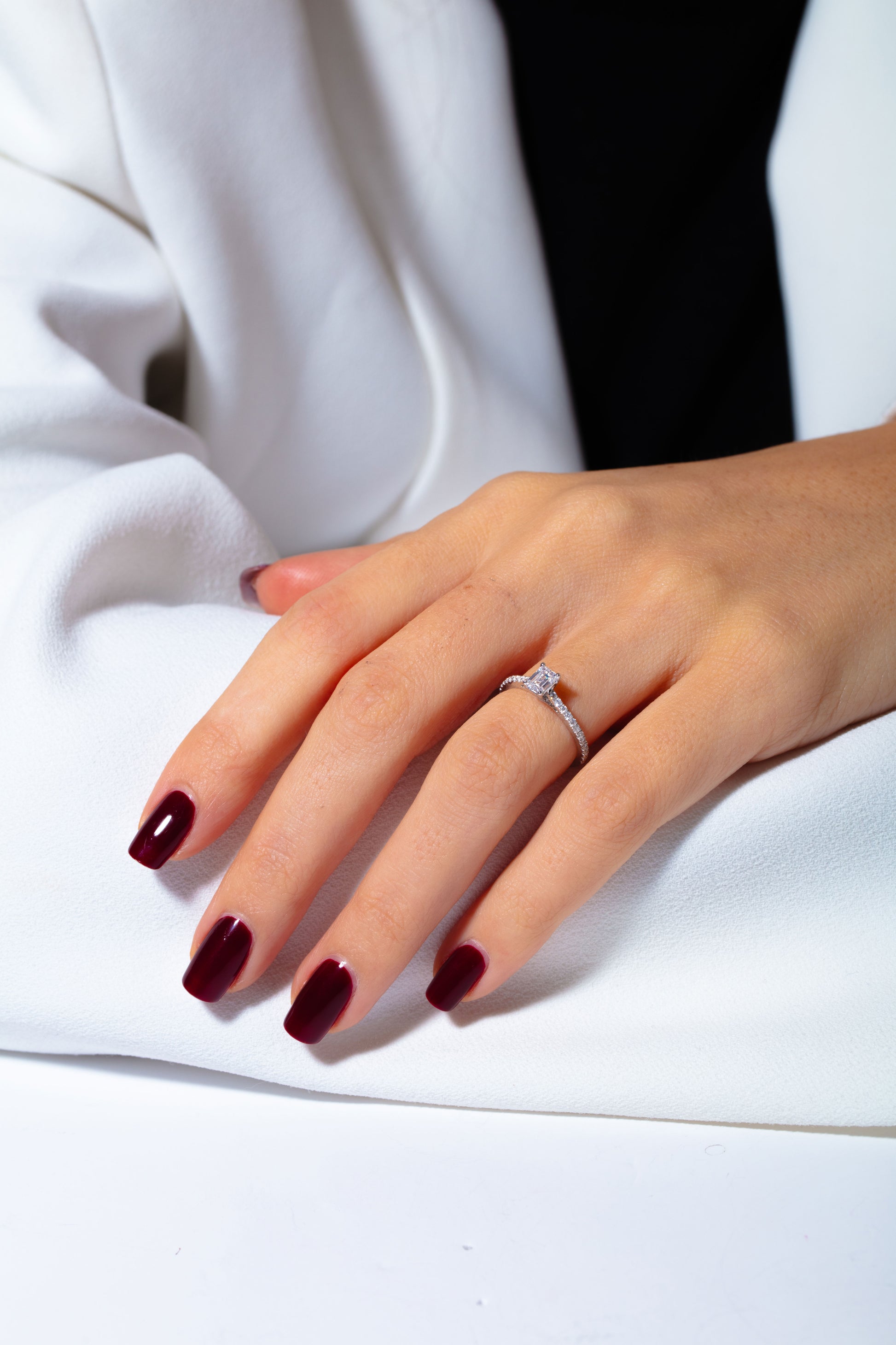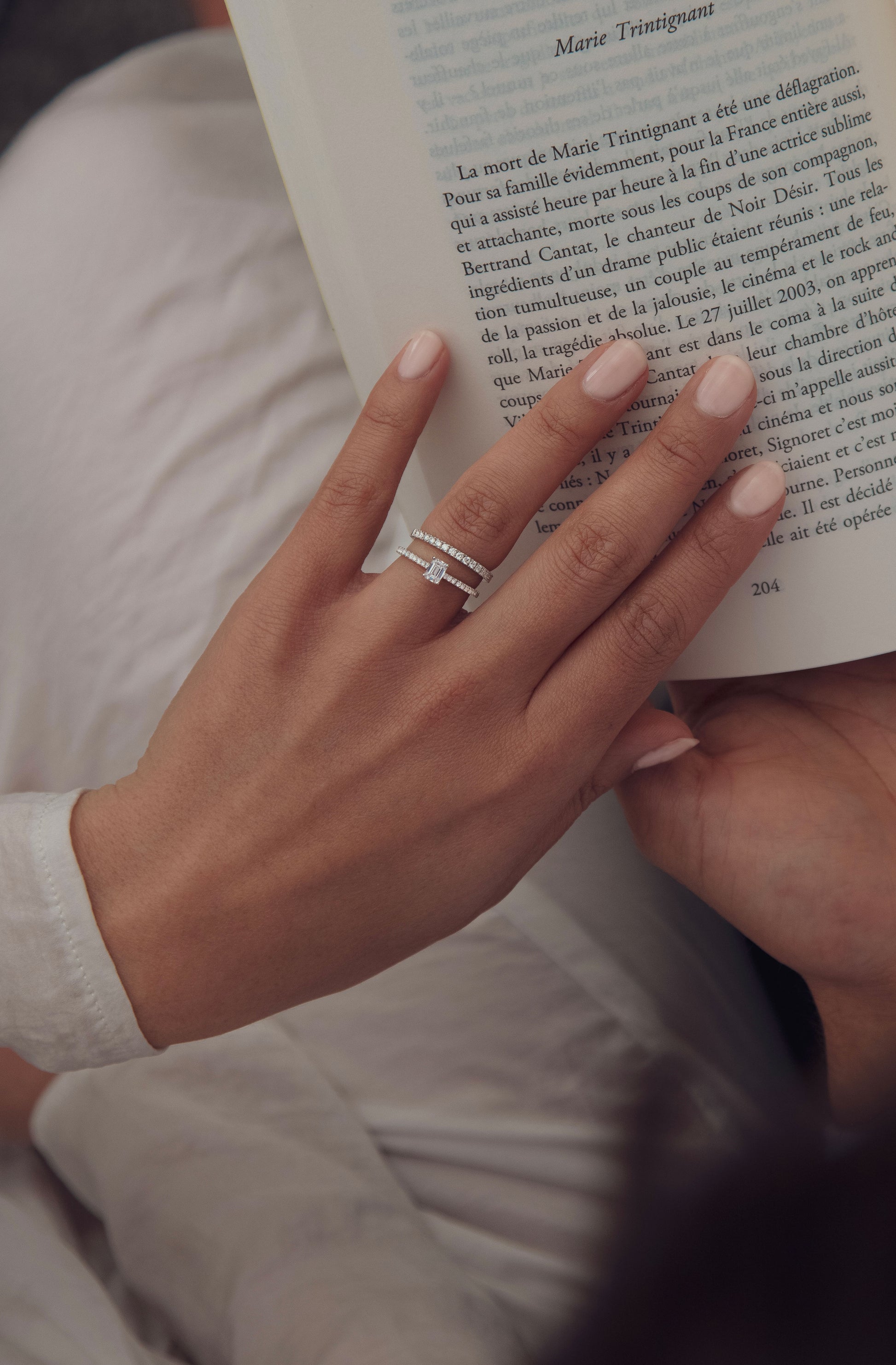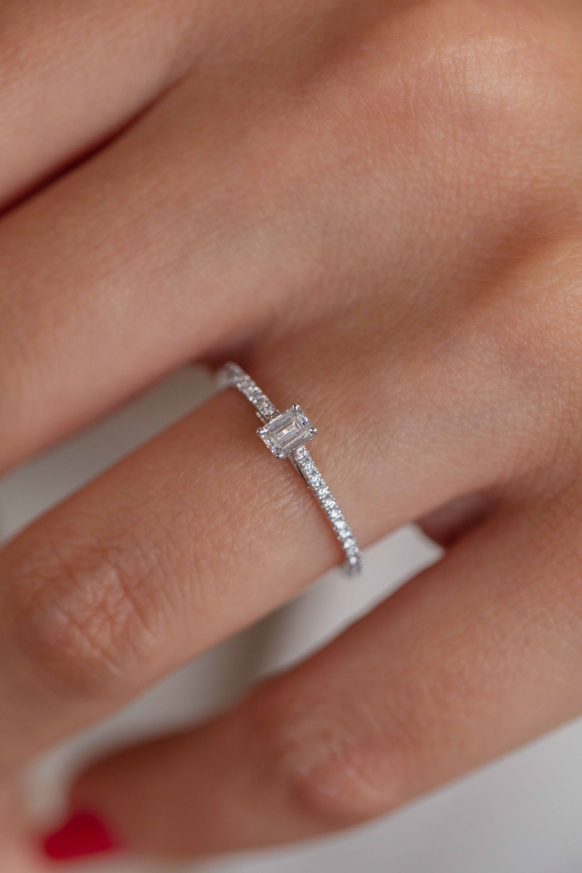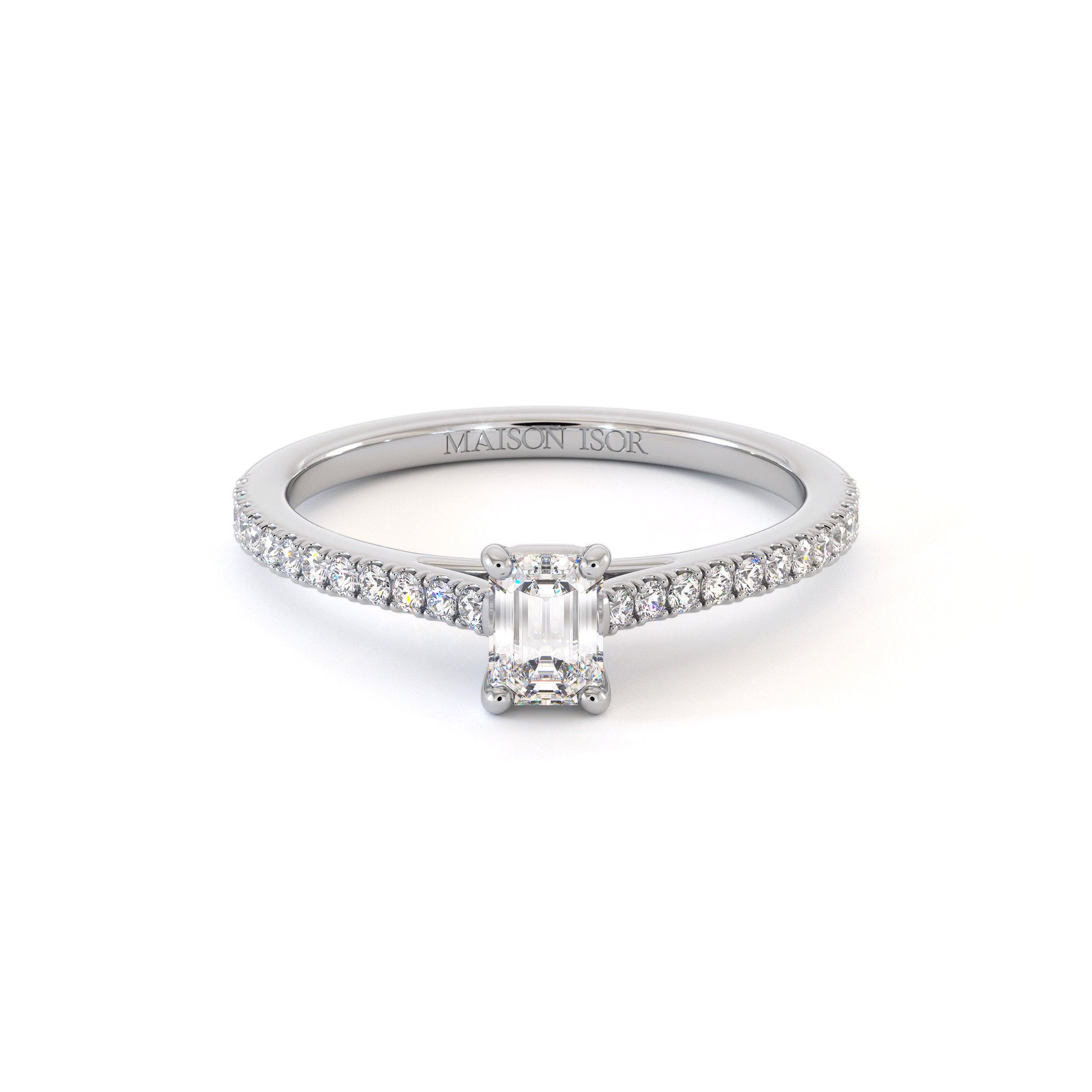 Solitaire Venus en or 750/1000, serti d’un diamant taille émeraude rehaussé d’un pavage délicat.Un modèle éclatant et moderne, à associer avec l’alliance Makian.