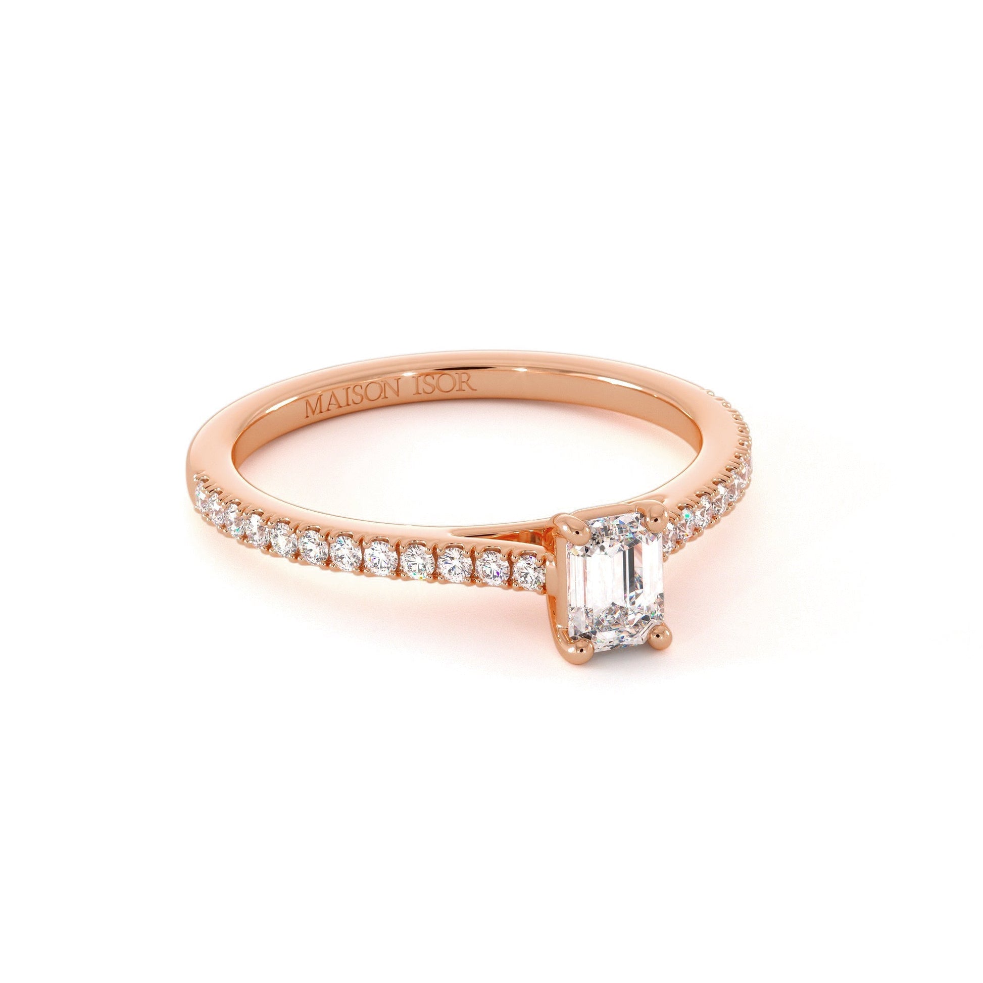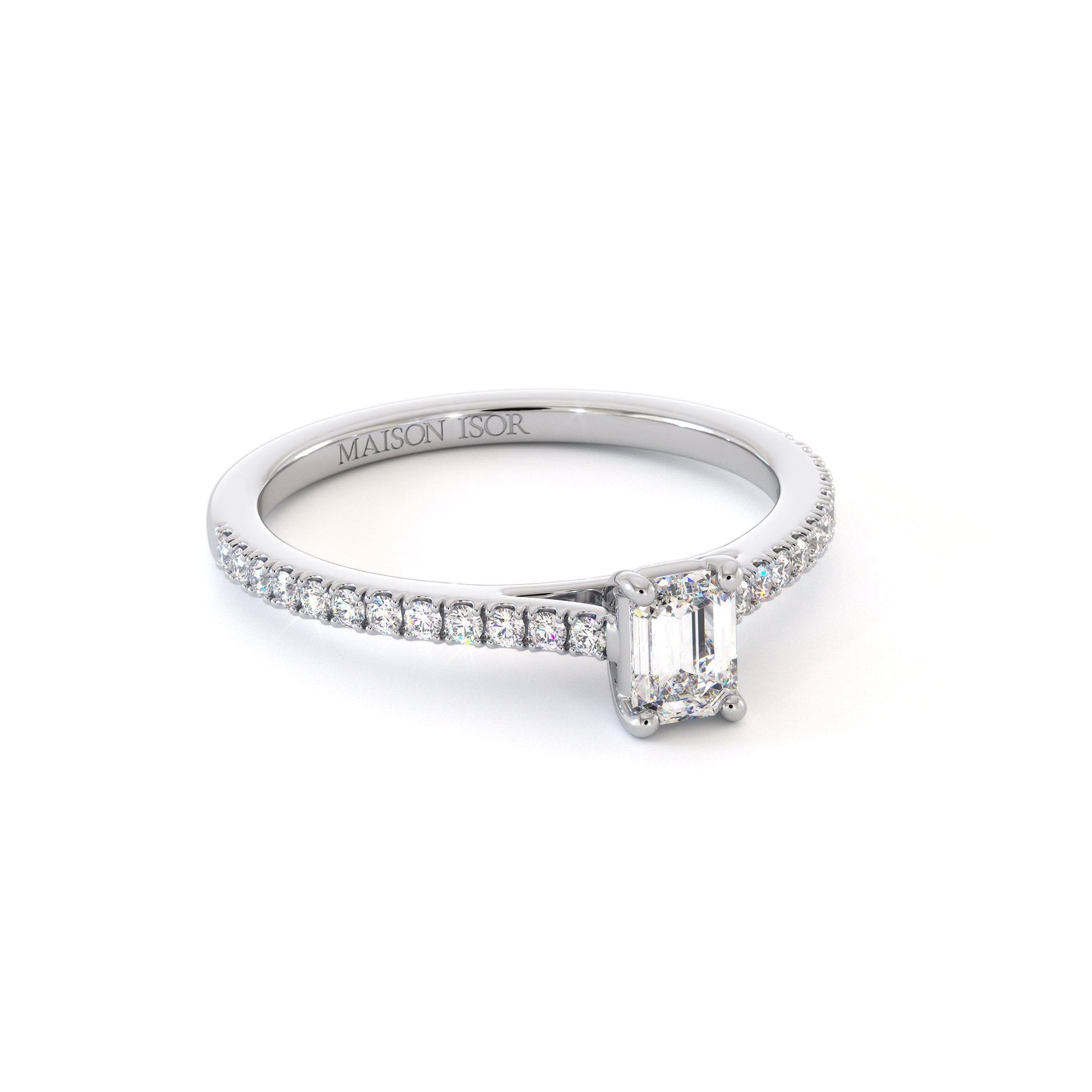 Solitaire Venus en or 750/1000, serti d’un diamant taille émeraude rehaussé d’un pavage délicat.Un modèle éclatant et moderne, à associer avec l’alliance Makian.